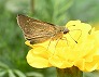 | マリーゴールドの花に来たチャバネセセリ (つくば市内、2025-08-22 撮影) |