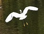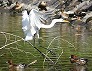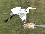 | 着水前のダイサギ 浮かんでいるのはヒドリガモ (つくば市内、2025-10-10 撮影) |