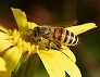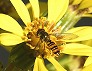 | ツワブキの花に来たナミハナアブ。体が花粉だらけ (つくば市内、2025-11-21 撮影) |