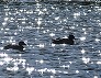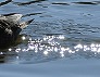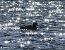 | カモの後ろにできた波紋が光を反射する (つくば市内、2025-11-21 撮影) |